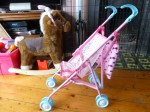 Izzie has this little fold up dolls’ pushchair and she likes to put Shovel in there and then pile lots of other stuffed toys in on top of her.
